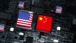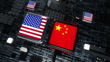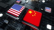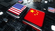 A close-up view of a motherboard featuring microprocessors labeled with Chinese and American flags, symbolizing the technological rivalry between the two nations.