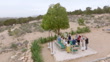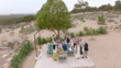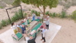 Extreme wide shot aerial view of senior newlyweds and guests sharing drinks and toasting at reception on outdoor patio of villa during destination wedding in Morocco