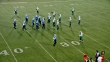 WS SLO MO Aerial view. Professional football teams break huddle and come to line of scrimmage, quarterback takes snap and hands off to running back who sprints and spins past defensive line and runs ball into end zone for touchdown. - 4K stock video