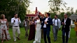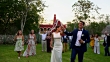 MS Bride and groom holding sparkler together while celebrating with friends - 4K stock video