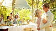 Bride and groom hugging and talking at wedding reception. MS, LR pan.