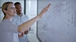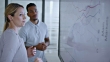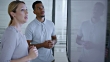Medium handheld shot of a Caucasian woman discussing a graph shown on the screen in the meeting room with her African-American male colleague. Shot in Slovenia.