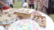 MS Dolly right Camera and selective focus with color grading. Use for background clip or insert shot of Different appetizer canape on white plate on a table for outdoor wedding and events.