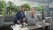 High five, wow and motivation with a business people celebration, success and travel with work in an airport together. Teamwork, collaboration and goal with a woman employee and man partner working - 4K stock video