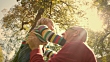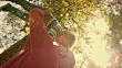 Slow motion medium low angle handheld shot of a man raising his small child in the air above his head under a tree in the sunny park and they both laugh. Shot in Slovenia.