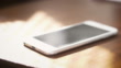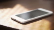 Mobile phone on wooden table with sunlight. Early morning feel. The phone is turned off. Black screen. No people. The sunlight becomes brighter and illuminates the scene.