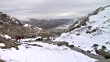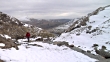 WS Mountaineer walking up snow covered mountain path / Llanberis, Snowdonia, UK - HD stock video