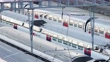 Zurich, Switzerland - 28 May 2021: View from above onto a passenger train leaving Zurich railway station.