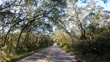 Quiet drive on empty, straight asphalt road with curving oaks forming a tree tunnel above the roadway - 4K stock video