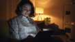 Cheerful young woman drinking a cup of tea late in night while watching a movie using a digital tablet.