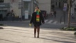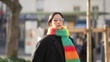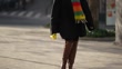 PARIS, FRANCE - JANUARY 20: (SLOW-MO) Samia Laaboudi wears a neon orange/yellow/red/green striped print pattern fluffy wool large scarf from Loewe, a black oversize blazer from The Frankie Shop, a black turtleneck from COS, black knitted shorts from Jacquemus, a Yellow Nano Twister Shoulder Bag from JW Anderson, knee-high cowboy boots from Loie and 90s style metallic gold sunglasses from le Specs outside Kolor during the Menswear Fall/Winter 2024/2025 as part of Paris Fashion Week on January 20, 2024 in Paris, France. (Footage by Edward Berthelot/Getty Images)