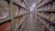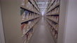 A last moving, wide angel trucking shot though a very long corridor of shelving in the basement of a large library in New York City.