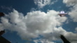 A model ufo spoof flying saucer made from paper plates and flower pots flying through a timelapse sky with white clouds.