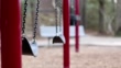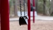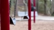 Swings slowly moving back and forth on empty school or park playground. Bench and trees in background. No people. Loneliness, child abuse, childhood, education concepts.