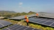 Three engineers are checking the condition of the solar power plant under the blue sky and white clouds