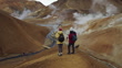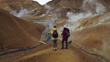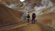 Hiking in the Kerlingarfjoll volcanic massive rainbow mountains in Iceland. Steam from the geothermal areas and hot springs underground