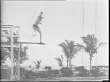 University of Miami football players running toward camera in a single file line each throwing a football in the air / two football players leaning forward passing footballs back between their legs / close up on football player grabbing from a pile of footballs / a player catches a ball and throws it while other players wait around him / wide shot of the university football players standing in a half circle on Tahiti Beach with their coach / a football player catches coconut and runs off screen / football players wearing only helmets and swim trunks practice blocking on a pier and push their partners in to the ocean water / six football players standing to form a line in the water as one player throws a football to another player jumping of a diving board in to the water / a player running down the diving board to jump and catch a throw / football player catching a throw and falling into the water making a big splash / another view of the line of players throwing the footballs / a player jumping and catching a pass / another view of the diving board as another player jumps off for a pass / a wide view of the diving board passing training.