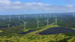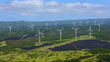 Aerial shot of wind farm and solar farms on the island of Oahu in Hawaii. Shot in USA.