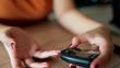 Young diabetic patient using blood sugar monitoring kit for testing at home.