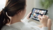 Woman sit down on sofa in living room at home searching for film or TV series to watch for leisure. choosing movie on streaming service. Over the shoulders view.