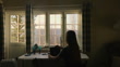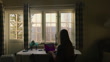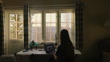 4k video footage of кear view of female with long hair contemplating a morning in her mountain cabin working freelance by laptop in the bright white Scandinavian living room in Norway
