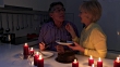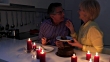 Senior couple is sitting behind a table. They are eating chocolate cake.